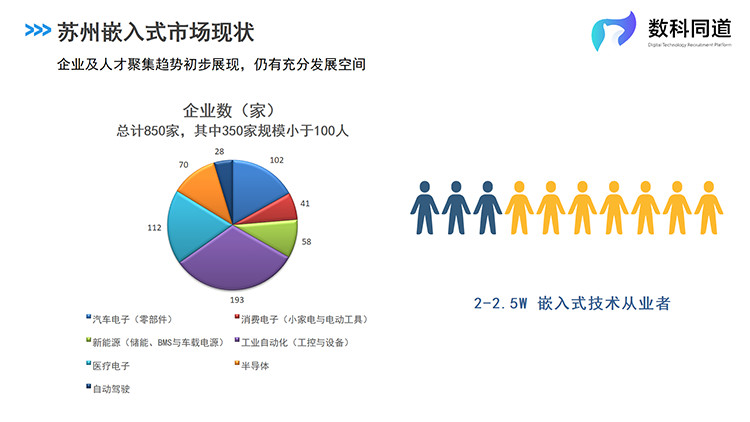 根据Ezpay钱包国际人力资源公司及数科同道业务团队对苏州市场的详细调研,现在苏州全市拥有嵌入式研发团队的企业数量为850家,主要集中在工业自动化、医疗电子、汽车电子等细分行业,其中百人以上规模企业500家。